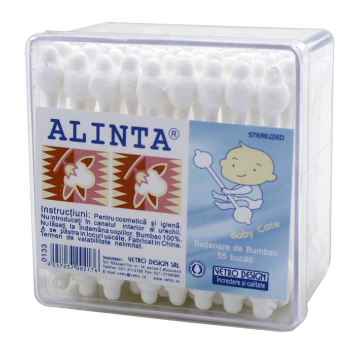 Betisoarele de urechi pentru copii si bebelusi ALINTA, cu opritor si capete din 100% bumbac, sunt concepute pentru igiena zilnica si intretinerea zonelor sensibile. Fiecare betisor este realizat dintr-un suport rezistent, prevazut la ambele capete cu vata de bumbac compacta, moale si absorbanta, asigurand o curatare precisa si delicata. Forma speciala cu opritor previne patrunderea excesiva in canalul urechii, contribuind la o utilizare sigura si controlata.