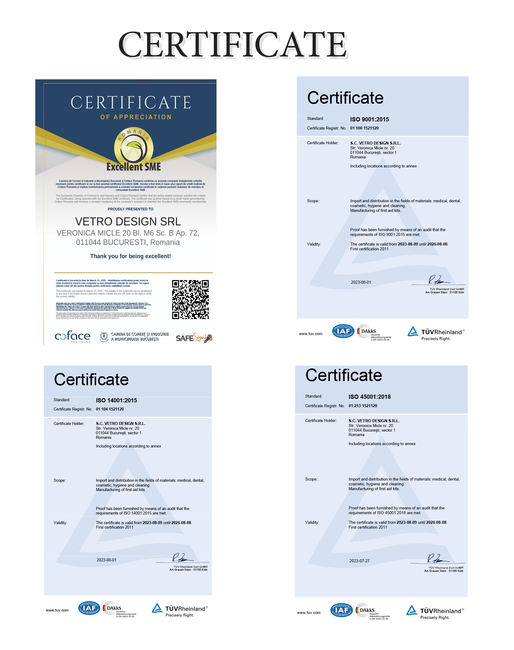 VETRO DESIGN S.R.L. разполага с следните разрешителни и сертификати: