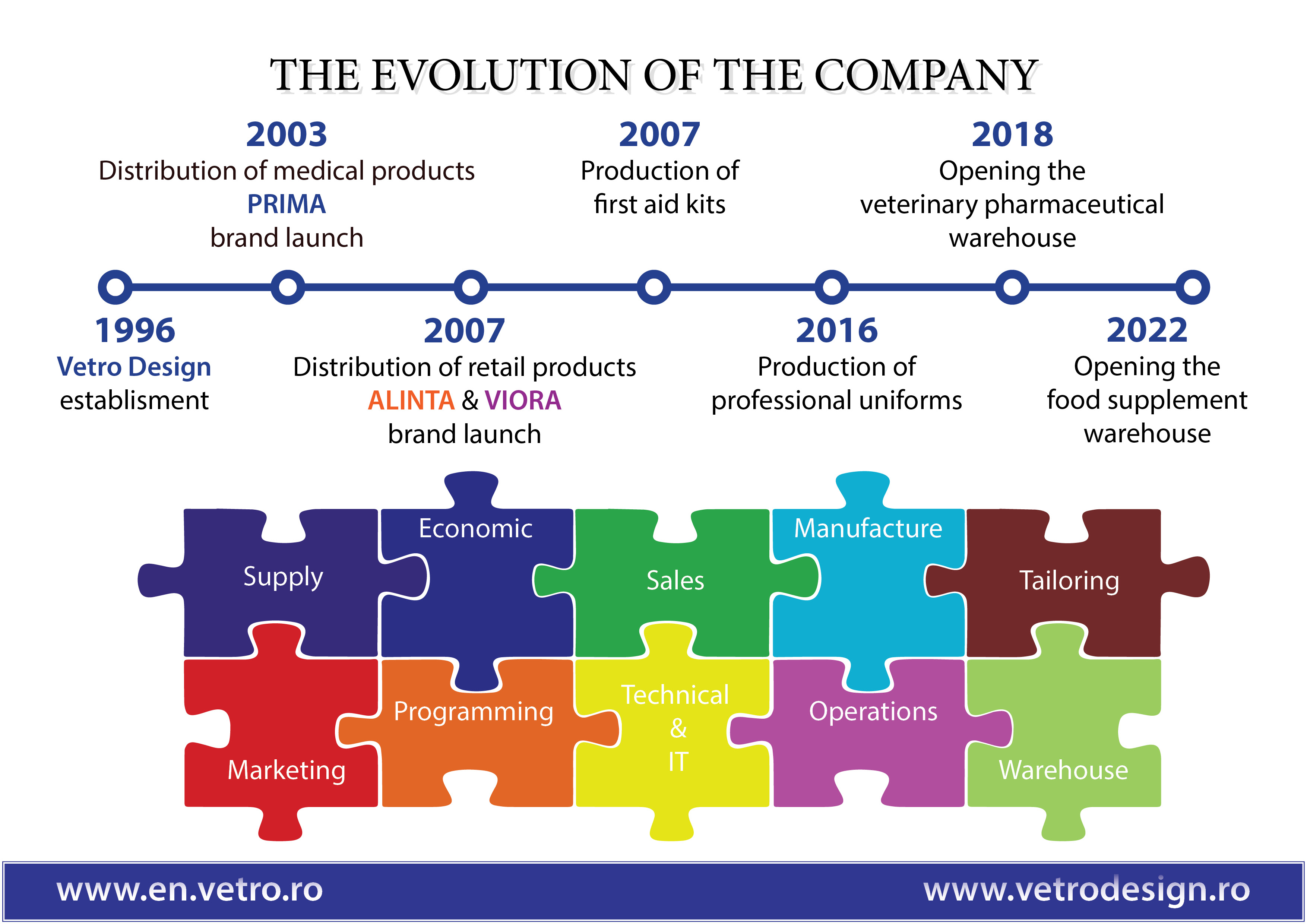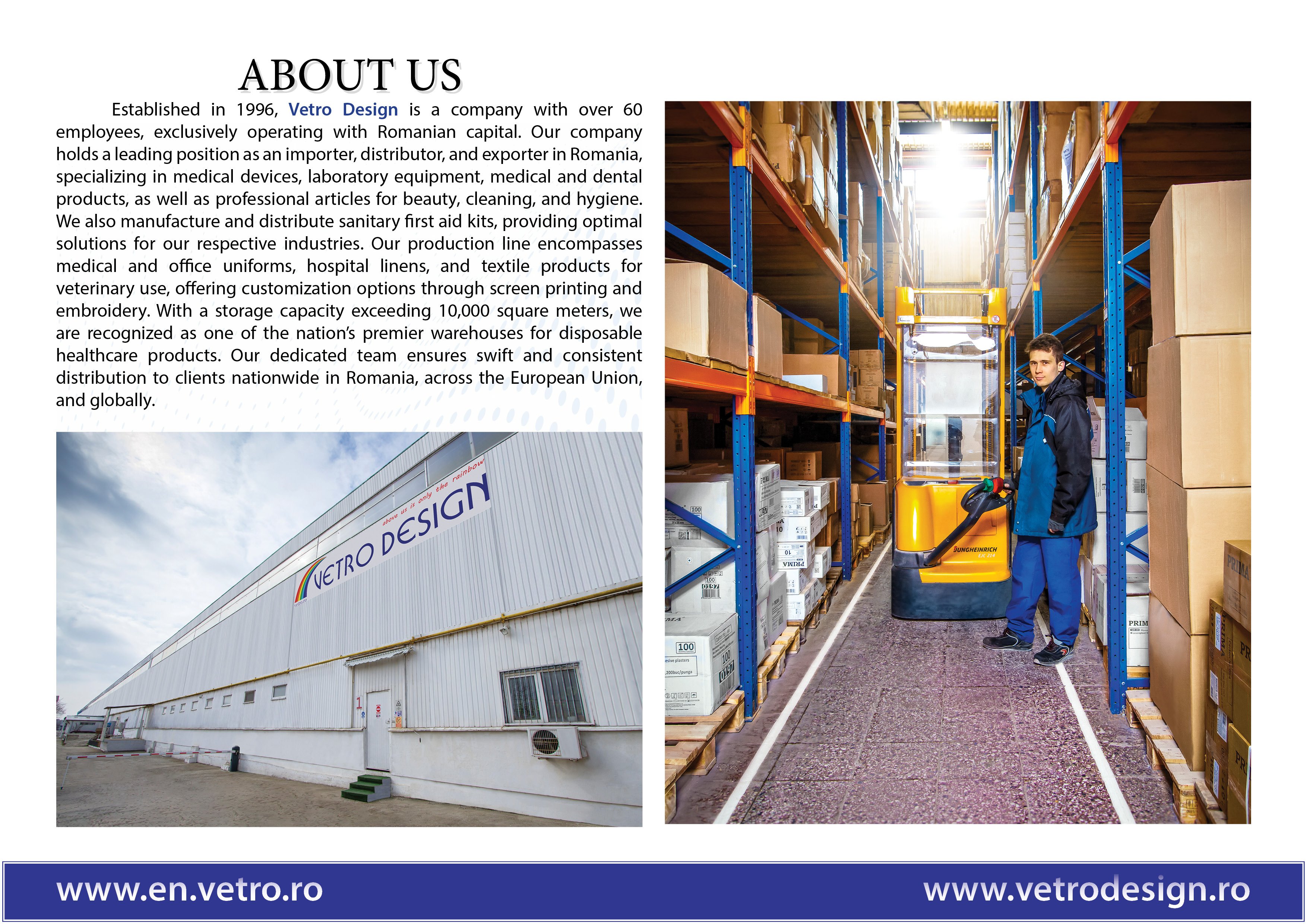 Ветро Дизайн е компания с над 29 години опит и повече от 60 служители, работеща изключително с румънски капитал. Нашата компания е сред основните вносители, дистрибутори и износители на медицински и лабораторни уреди и продукти, стоматологични и ветеринарни продукти, професионална козметика за индустрията за красота, както и почистващи и хигиенни продукти в Румъния.