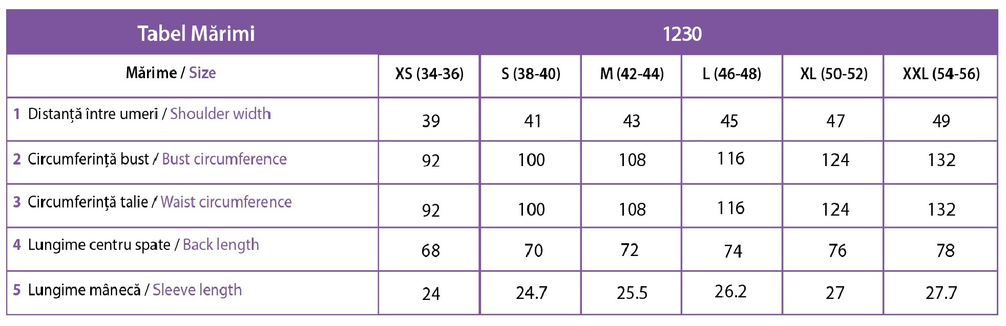 • XS (34-36): Umeri 39 cm, Bust 92 cm, Talie 92 cm, Lungime 68 cm, Lungime Maneca 24 cm