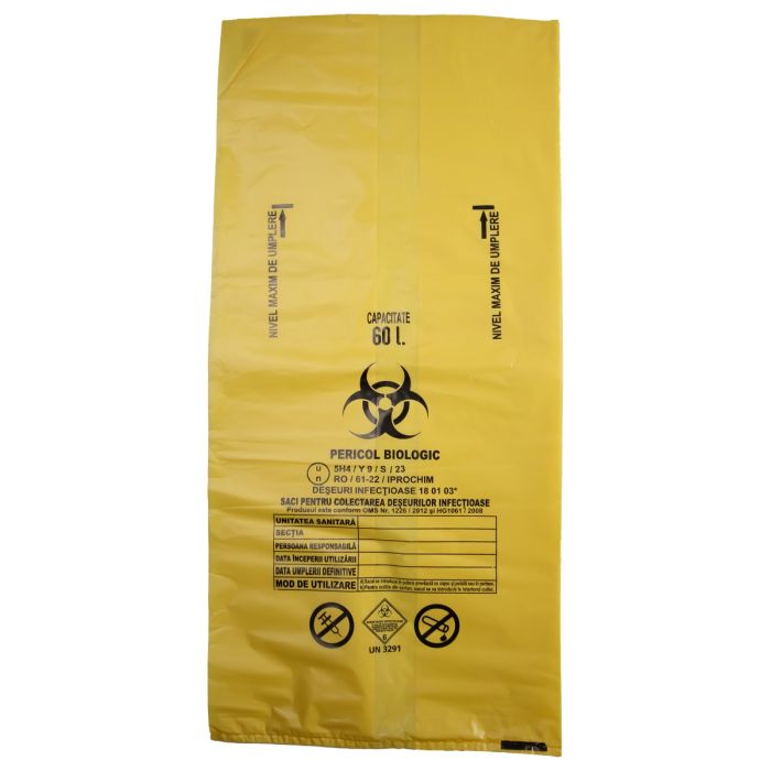 Recenzati:Saci galbeni pericol biologic 60L (600x700x0.05 mm) BIOHAZARD ADR, 50 microni, 50 bucati - saci deseuri medicale certificati