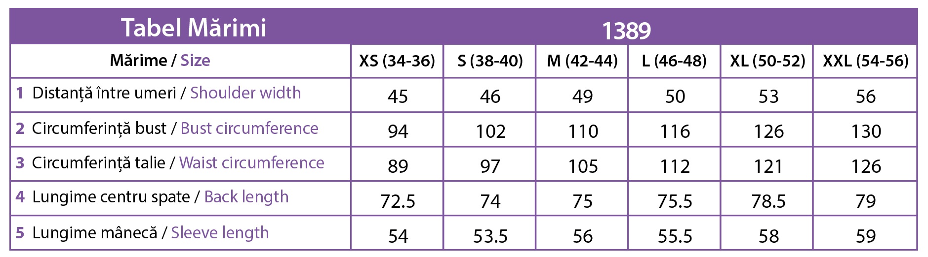 • XS (34-36): Shoulders 45 cm, Bust 94 cm, Waist 89 cm, Length 72.5 cm, Sleeve Length 54 cm