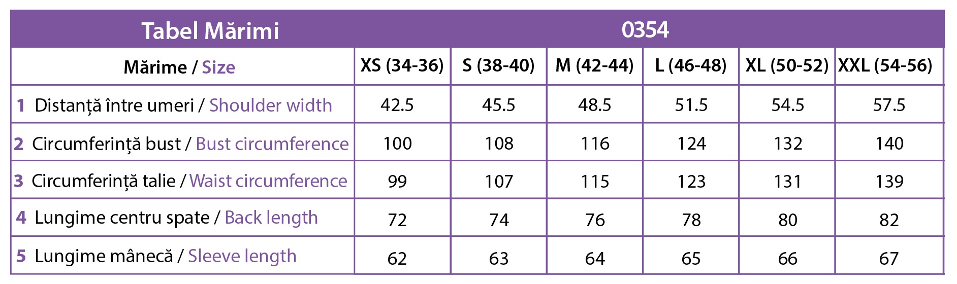 • M (42-44): Distanta intre umeri 48.5 cm, Circumferinta bust 116 cm, Circumferinta talie 115 cm, Lungimea centru spate 76 cm, Lungimea maneca 64 cm