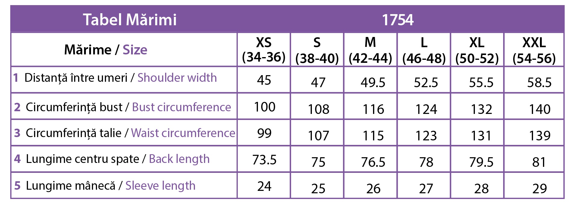 • XS (34-36): Umeri 45 cm, bust 100 cm, talie 99 cm, lungime 73.5 cm, lungime maneca 24 cm