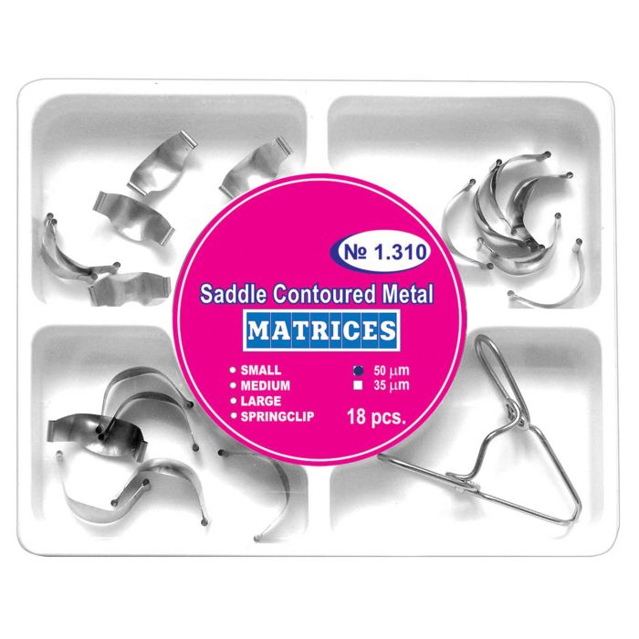 Setul contine 18 matrici metalice standardizate, grupate in trei dimensiuni: 6 bucati small, 6 bucati medium si 6 bucati standard. Aceasta varietate permite selectarea dimensiunii potrivite in functie de situatia clinica. In pachet este inclus si un cleste special conceput pentru fixarea matricilor, oferind control si precizie in timpul montarii si demontarii acestora.