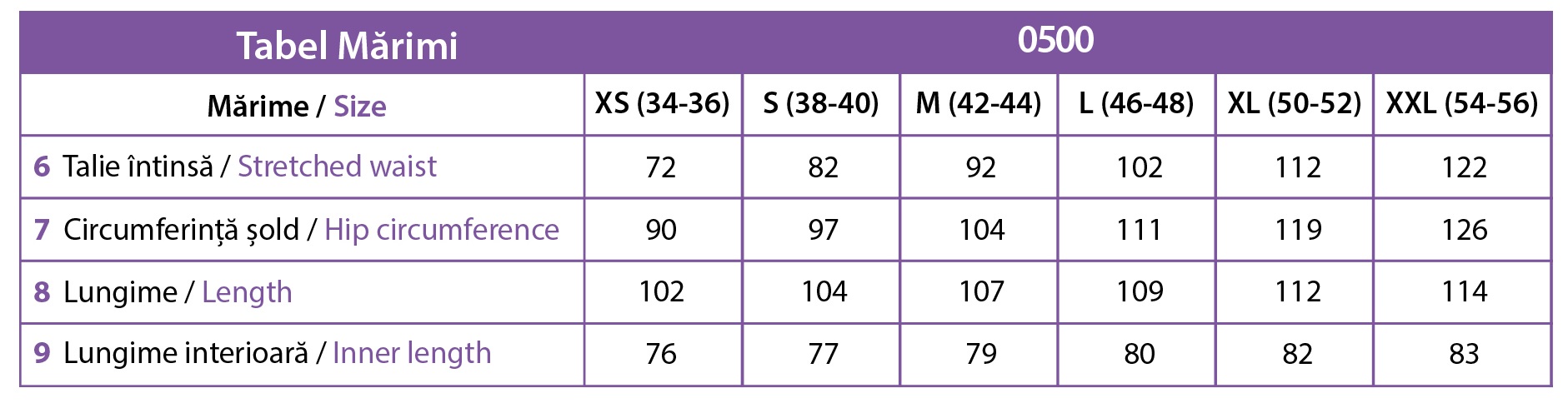 • 3XL (58-60): Talie intinsa 132 cm, sold 133 cm, lungime 117 cm, lungime interioara 85 cm