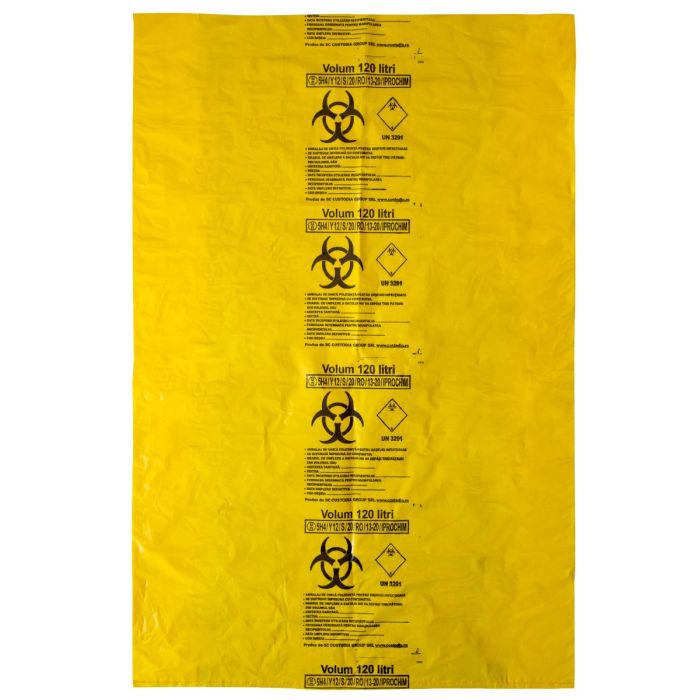 Sacul galben BIOHAZARD de 120 litri este conceput pentru colectarea, depozitarea si transportul deseurilor medicale si biologice periculoase, in conformitate cu cerintele legale si standardele ADR privind manipularea deseurilor periculoase. Acest model este frecvent utilizat in spitale, clinici, laboratoare, cabinete veterinare si unitati farmaceutice, unde este necesara o separare sigura a deseurilor infectioase si a materialelor contaminate.