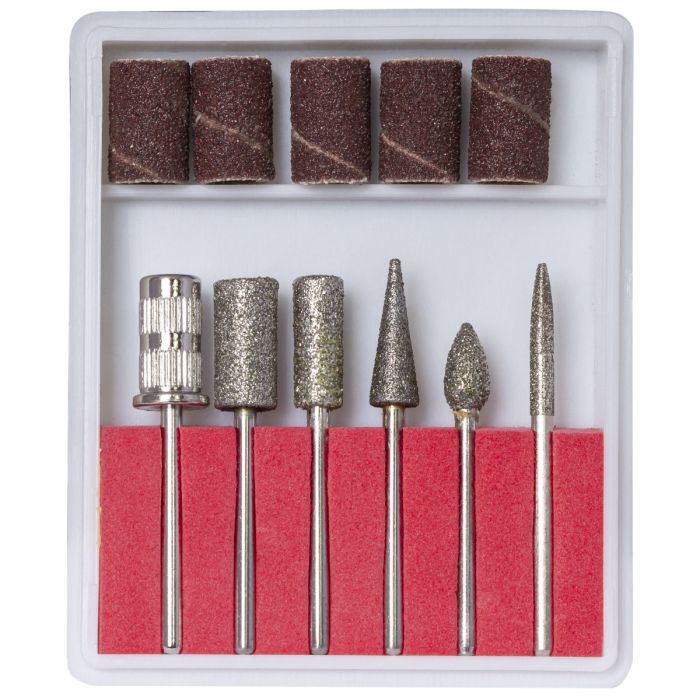 • Set complet: Include un adaptor pentru role abrazive, 5 capete de freza cu forme asortate, 5 inele abrazive si un suport pentru organizare.
