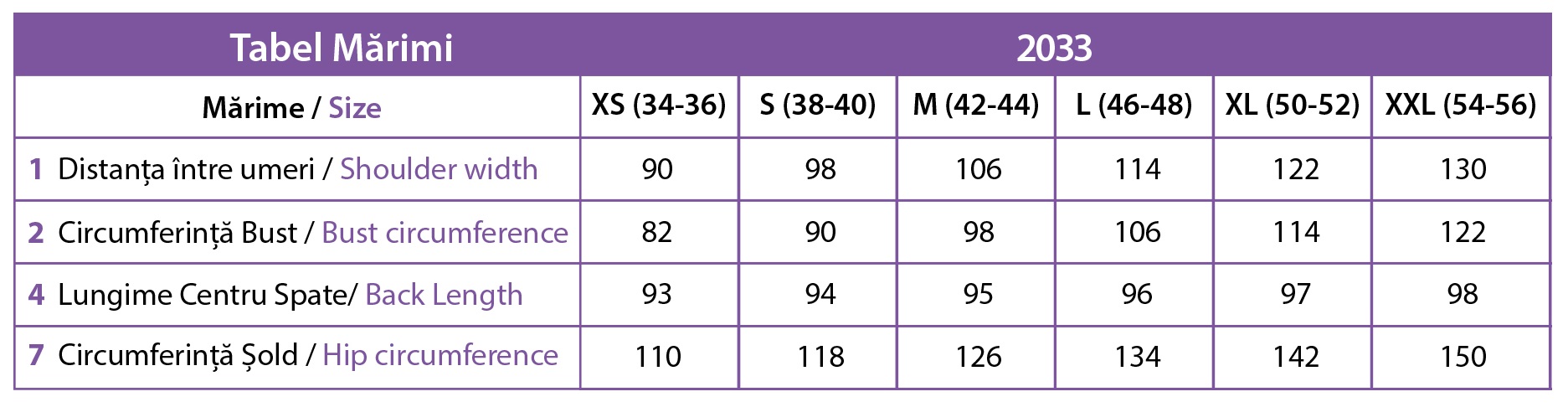 • XS (34-36): Umeri 90 cm, Bust 82 cm, Sold 110 cm, Lungime 93 cm